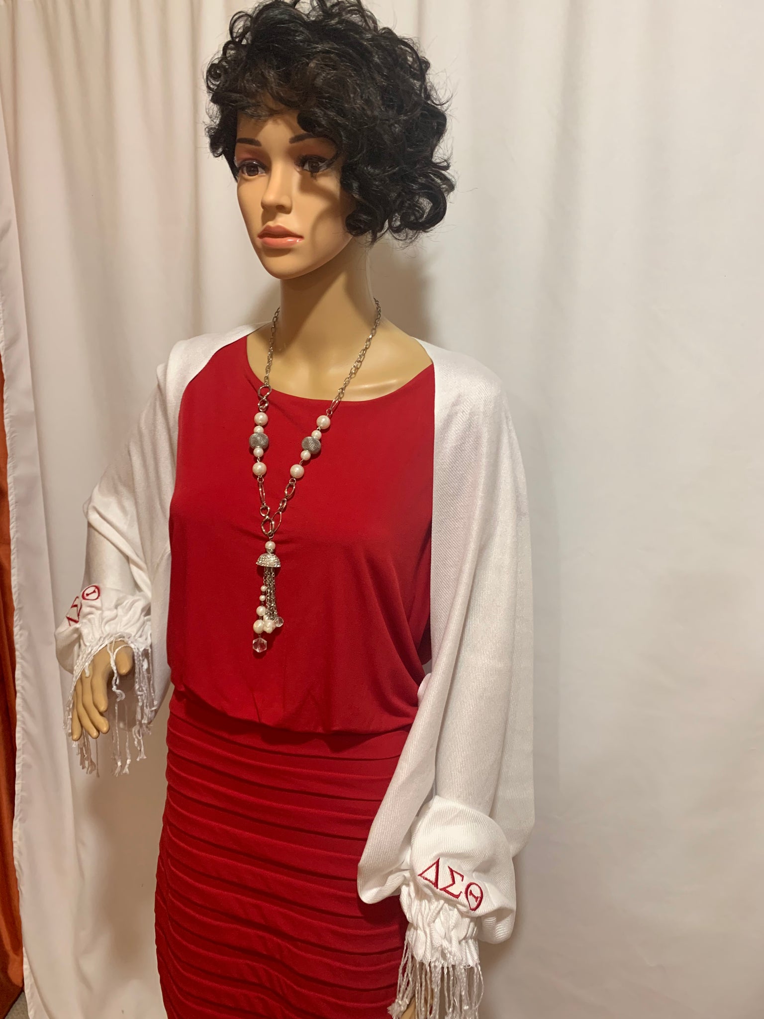 Sham Shawls are shawls with sleeves and styled like a bolero jacket! Excellent for Sorority ceremonies that require all white.